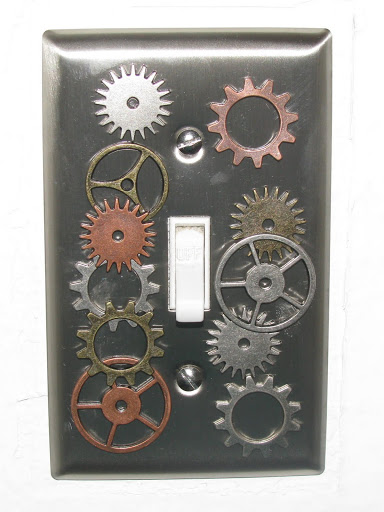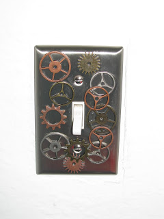 Anyway, this weekend I set out to start my own Steampunk project and decided to start small by modifying some electric switch face plates for my room. I bought some solid brass face plates and then went all over town looking for gears and sprockets to add to it for dramatic effect. Once I found my accessories, I used super glue to attach them to the face plates. The problem started when my fingers got glue on them because the peices I was working with were very small. When I stuck the sprocket to the face plate my fingers became stuck to the face plate too.