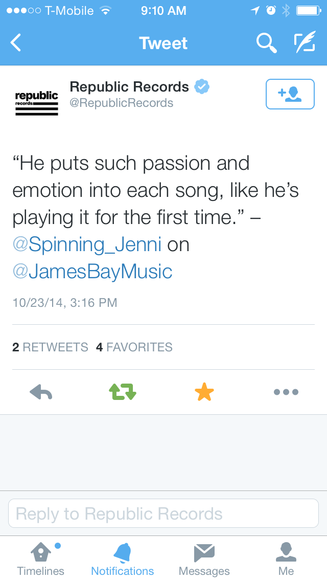 This may be completely amateur of me, but I don’t really care. I’m super pumped that Republic Records noticed my Music Monday post about James Bay ( You Should Be Listening to James Bay).